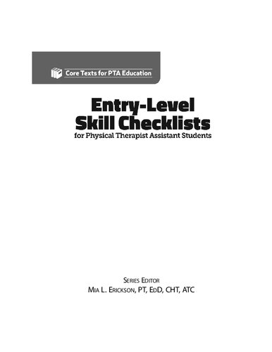 What?s included in Entry-Level Skill Checklists for Physical Therapist Assistant Students:Sections on data collection and interventionChecklists following each skill stage to record and evaluate progressCheckboxes for peer evaluation and instructor assessmentComment areas for instructors to provide feedback on development of student abilitiesAcross courses and programs, Entry-Level Skill Checklists for Physical Therapist Assistant Students will help students facilitate self-evaluation and professors gauge and document student progress in any PTA program.