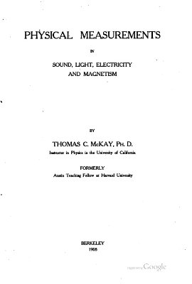 Berkeley: Stanley-Taylor Company, 1908, 196 p.This book is primarily intended as a text-book in physical measurements and a laboratory manual for second year students in physics at the University of California. At this institution there is offered to first year students a laboratory course in mechanics, properties of matter, and heat. The subjects considered in this book are therefore Sound, Light, Electricity, and Magnetism. The experiments here described have been chosen for the most part because they have proved to be valuable exercises in elementary laboratory courses given by instructors in physics at the University of California. A number of the experiments in this book have been described by Professor Drew, now of Leland Stanford University. Professor Hall of the University of California and Professor Minor of the University of Nevada have also contributed greatly to the development of the course. The writer has drawn upon several years experience at the University of California, as well as upon his previous experience at Harvard University, in the endeavor to select the most valuable experiments for an elementary laboratory course in the subjects of which this book treats. As compared with the books issued by the writer’s predecessors the sections on Electricity and on Sound have been enlarged. In the treatment of the subject of Electrostatics the writer is indebted to Professor Noack for his careful descriptions in his ”Elementare Messungen aus der Electrostatik.” Considerable use has also been made of Poynting and Thomson’s ”Sound” A description of the principal types of sensitive galvanometers has been given in the section on Electricity, with a short discussion of the conditions of greatest sensitiveness for these instruments.Measurement of velocity of sound, frequency of vibrations, and elasticities of materials.